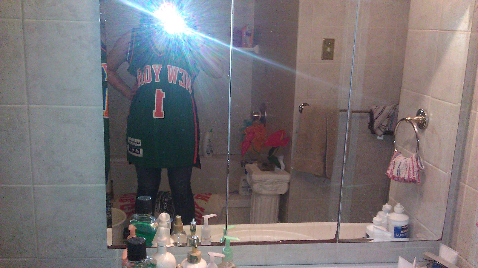 This is a reflection of me wearing my New York Knicks St. Patrick's Day edition jersey. Absolutely love the color and it's the jersey of one of my favorite players on the team right now, Amare Stoudemire. He struggled for a little bit in the beginning of this season, but he eventually got his groove back. However, he recently got injured and I'm upset that there's that possibility that he may be out for the rest of the season...just like Jeremy Lin. I guess we'll just have to wait and see how both players heal. Go Knicks!